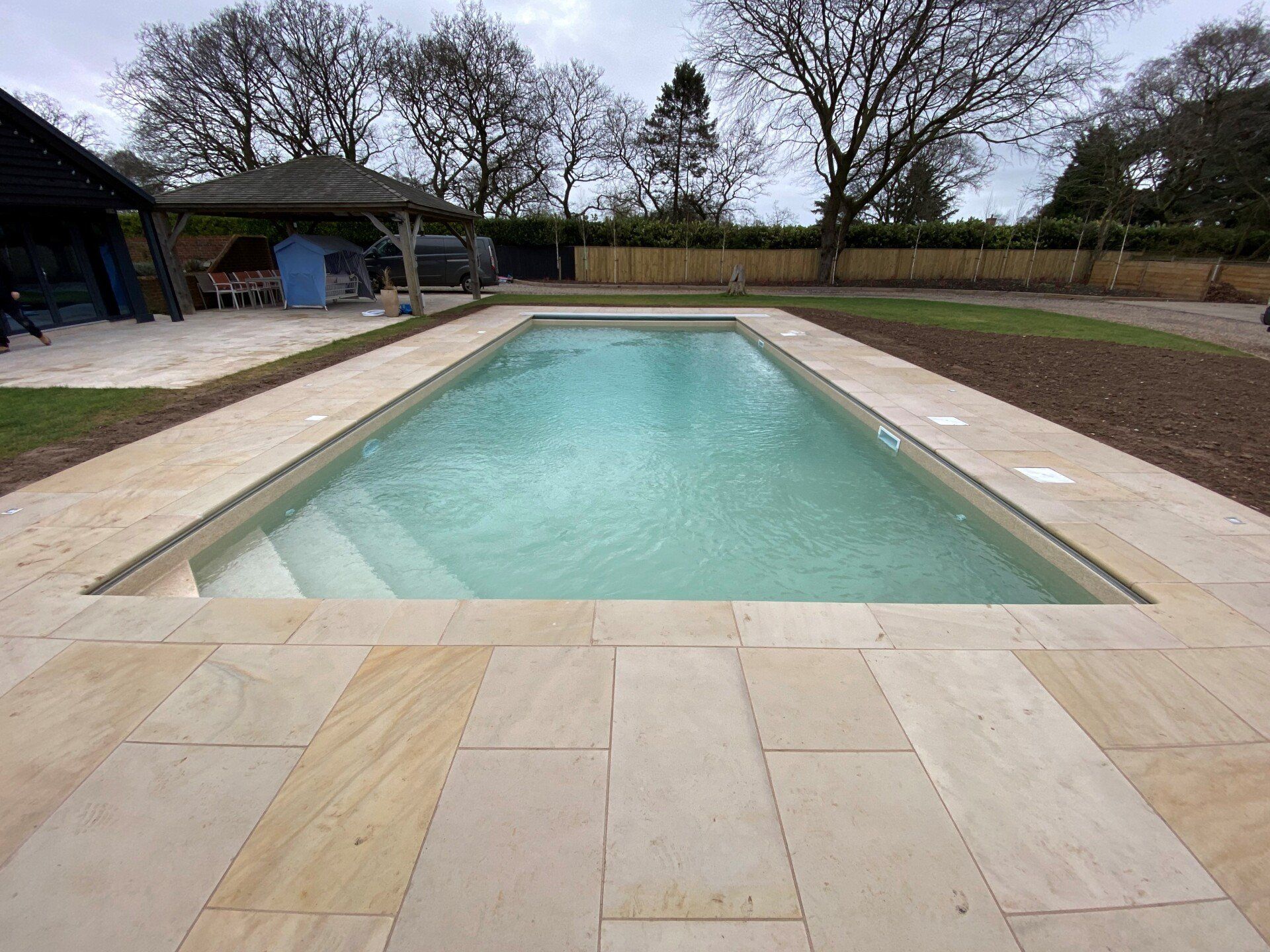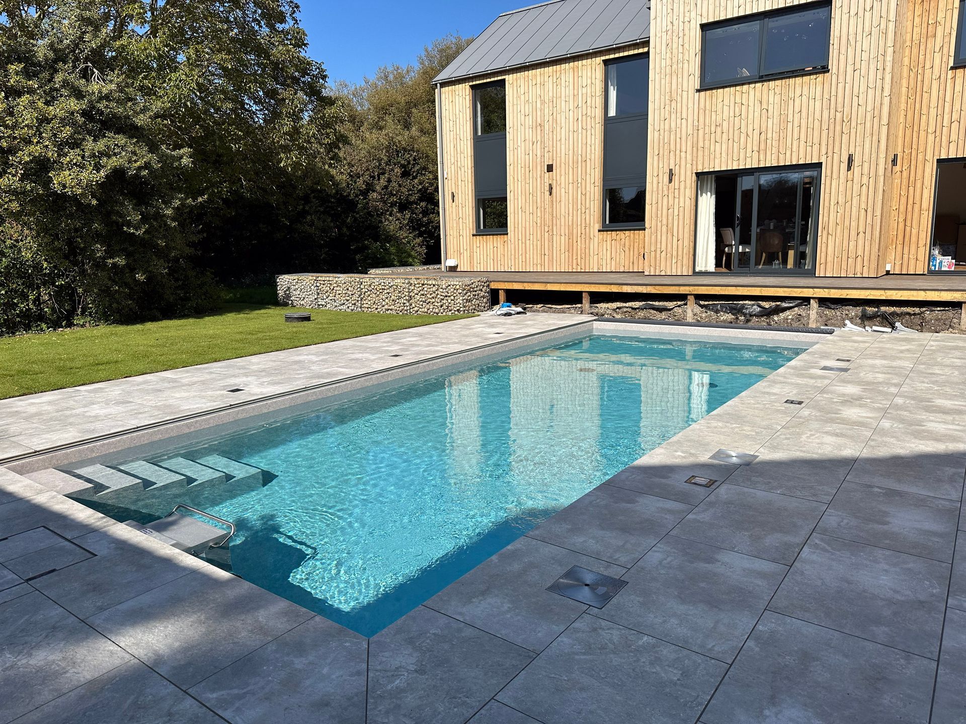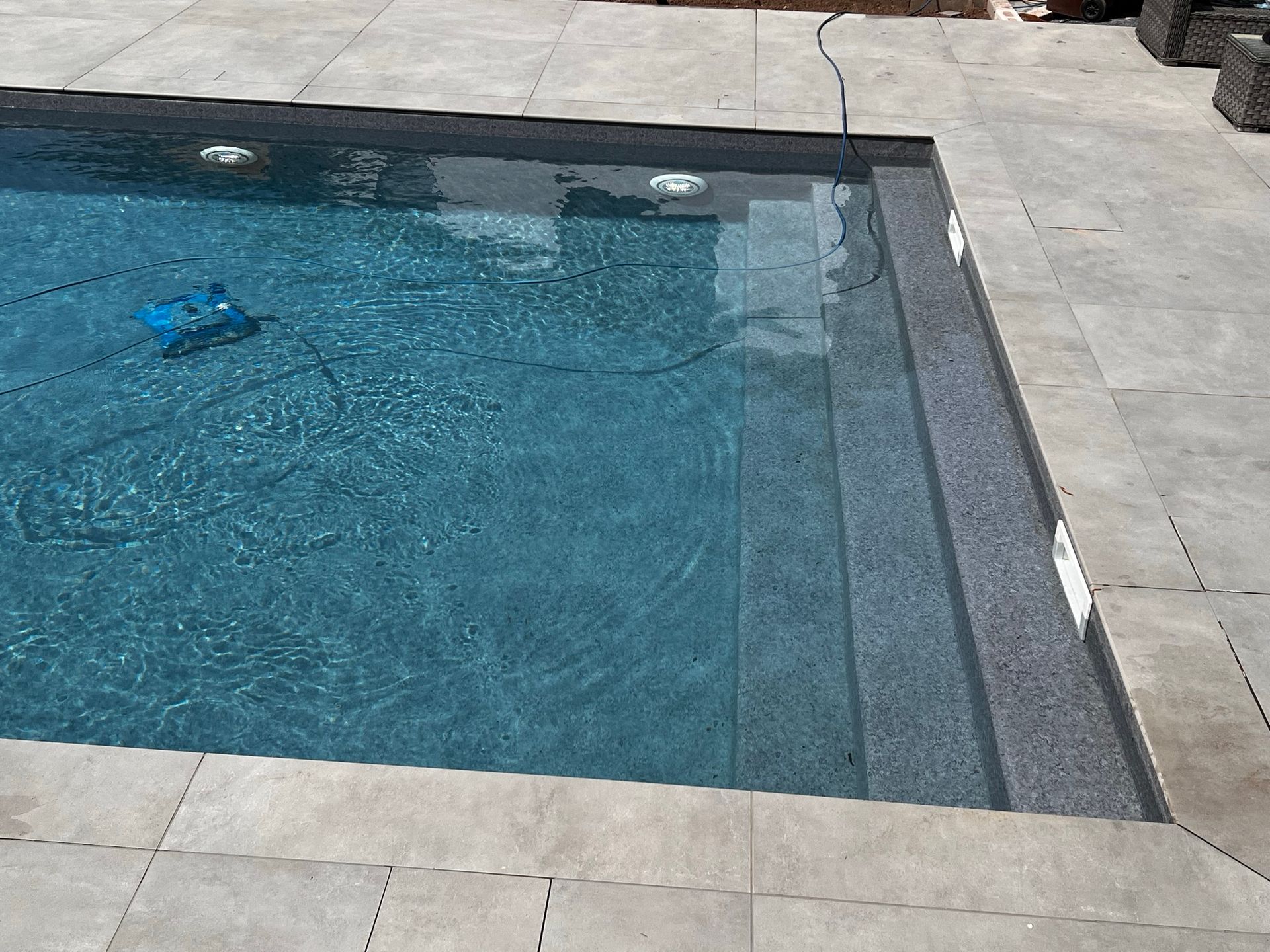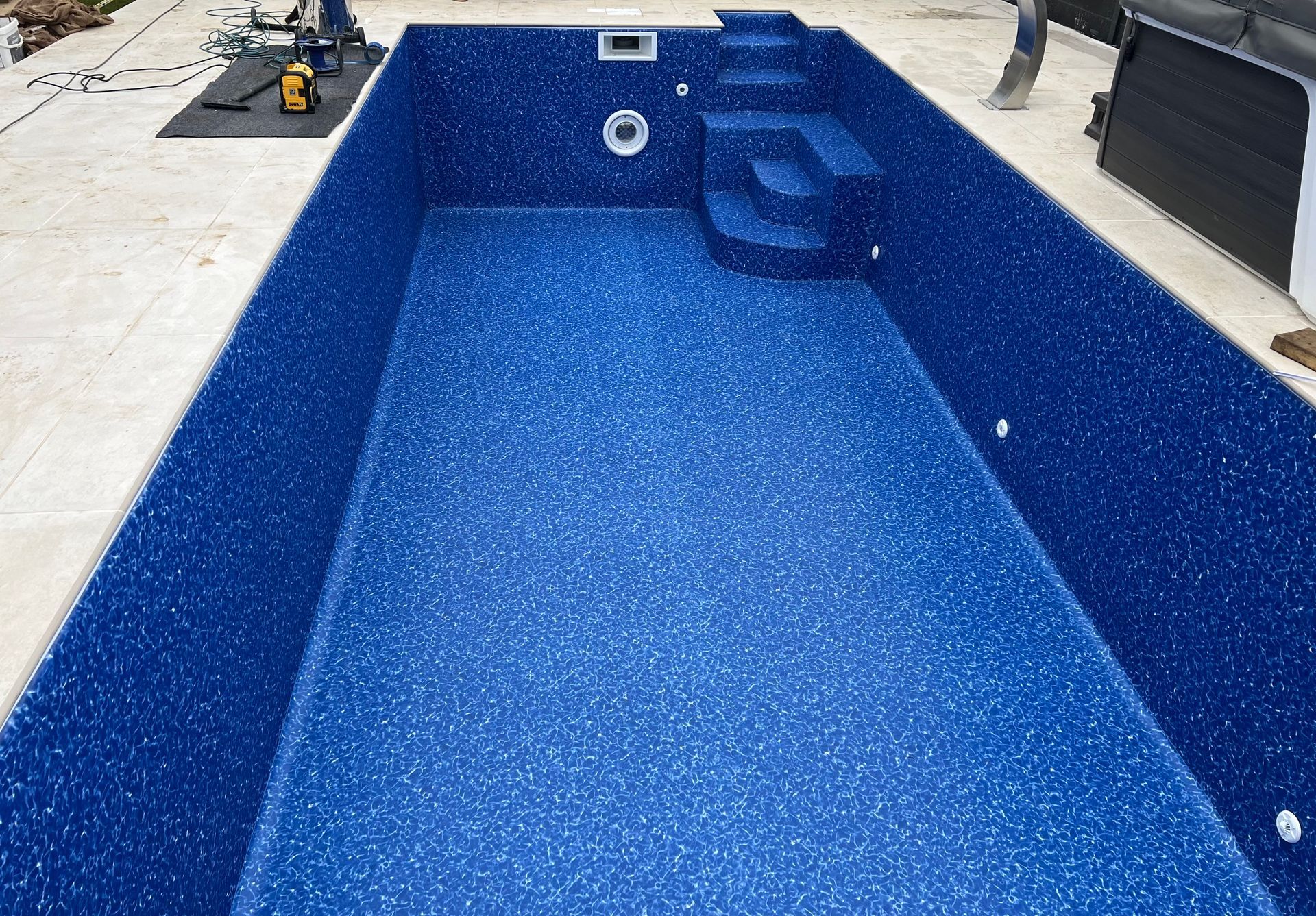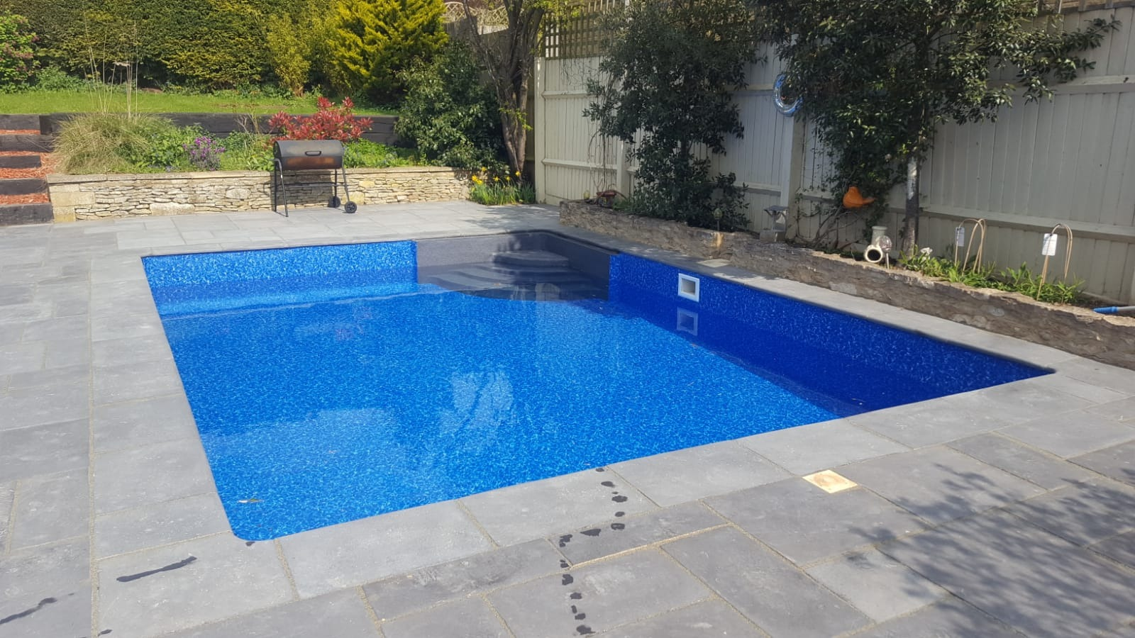 Water-filled Blue Sparks pool with Stoneflex Bazelet steps