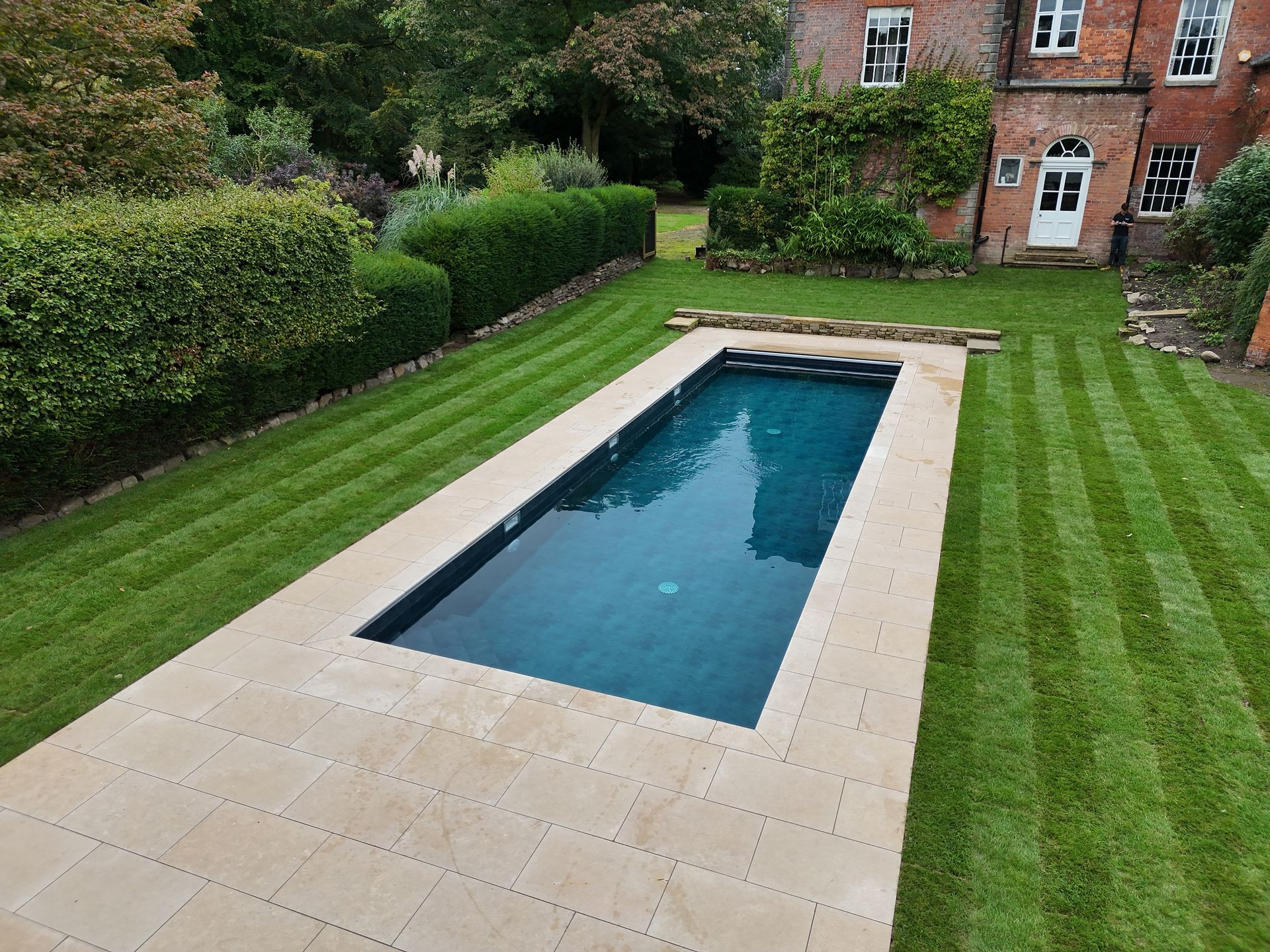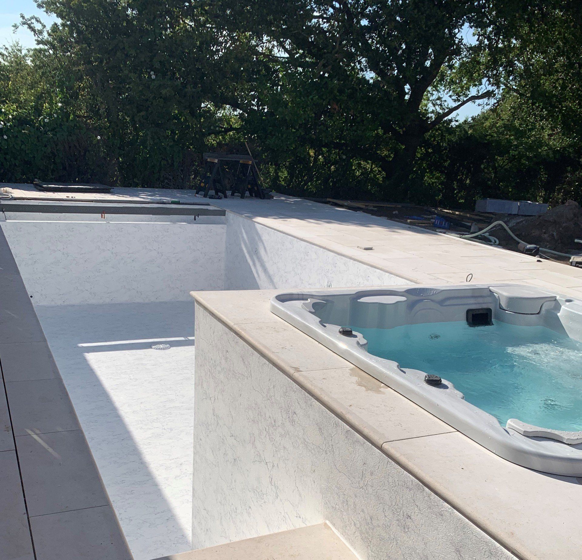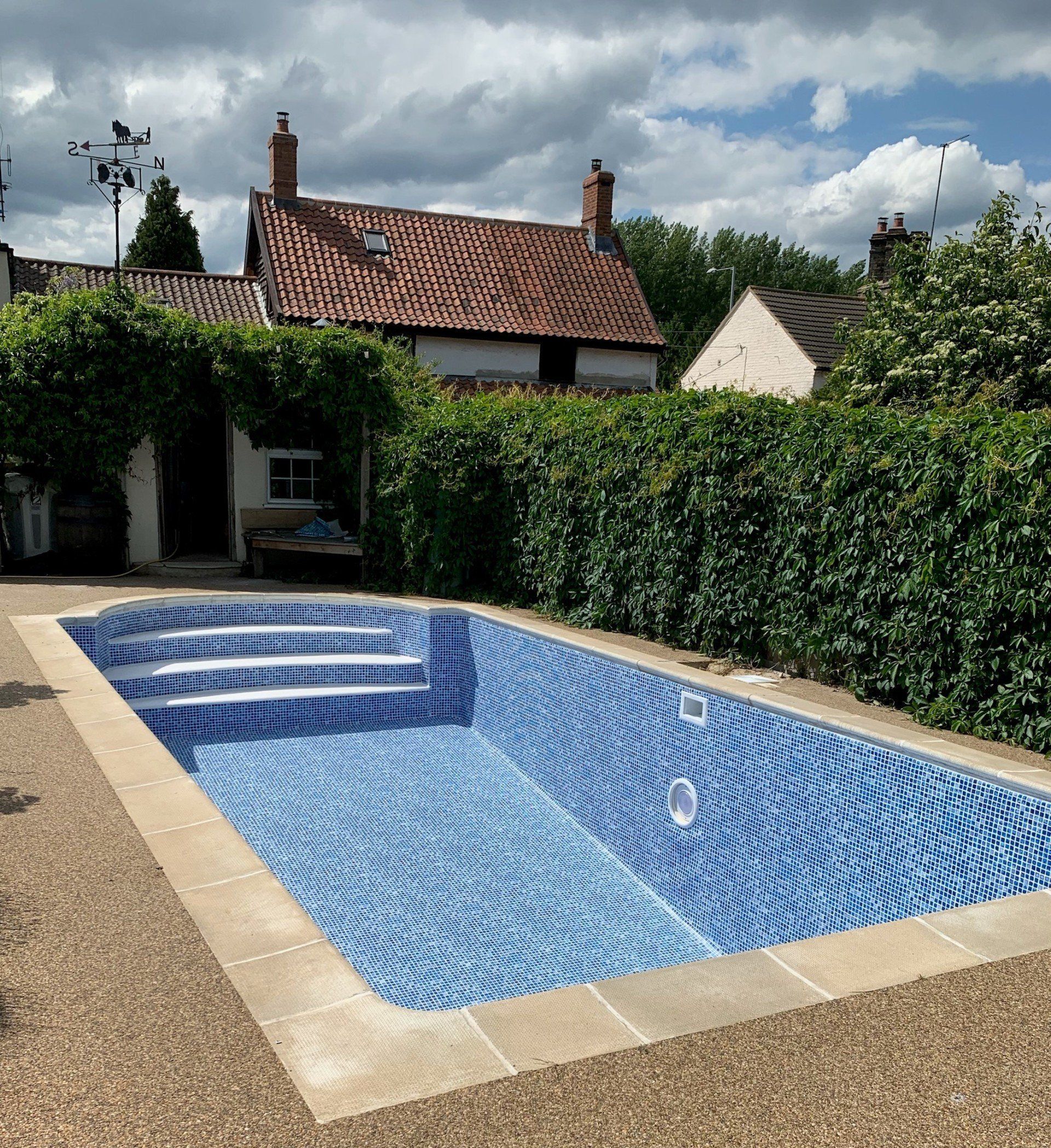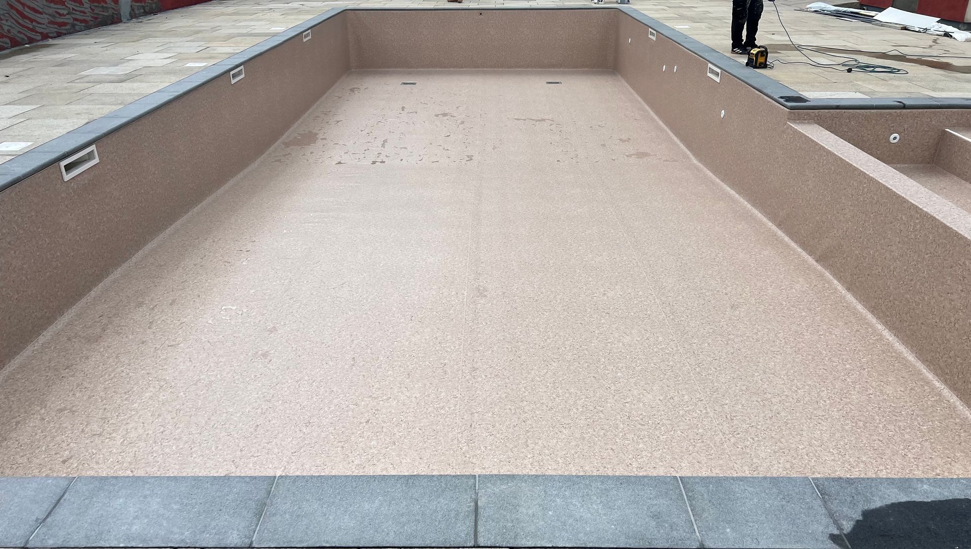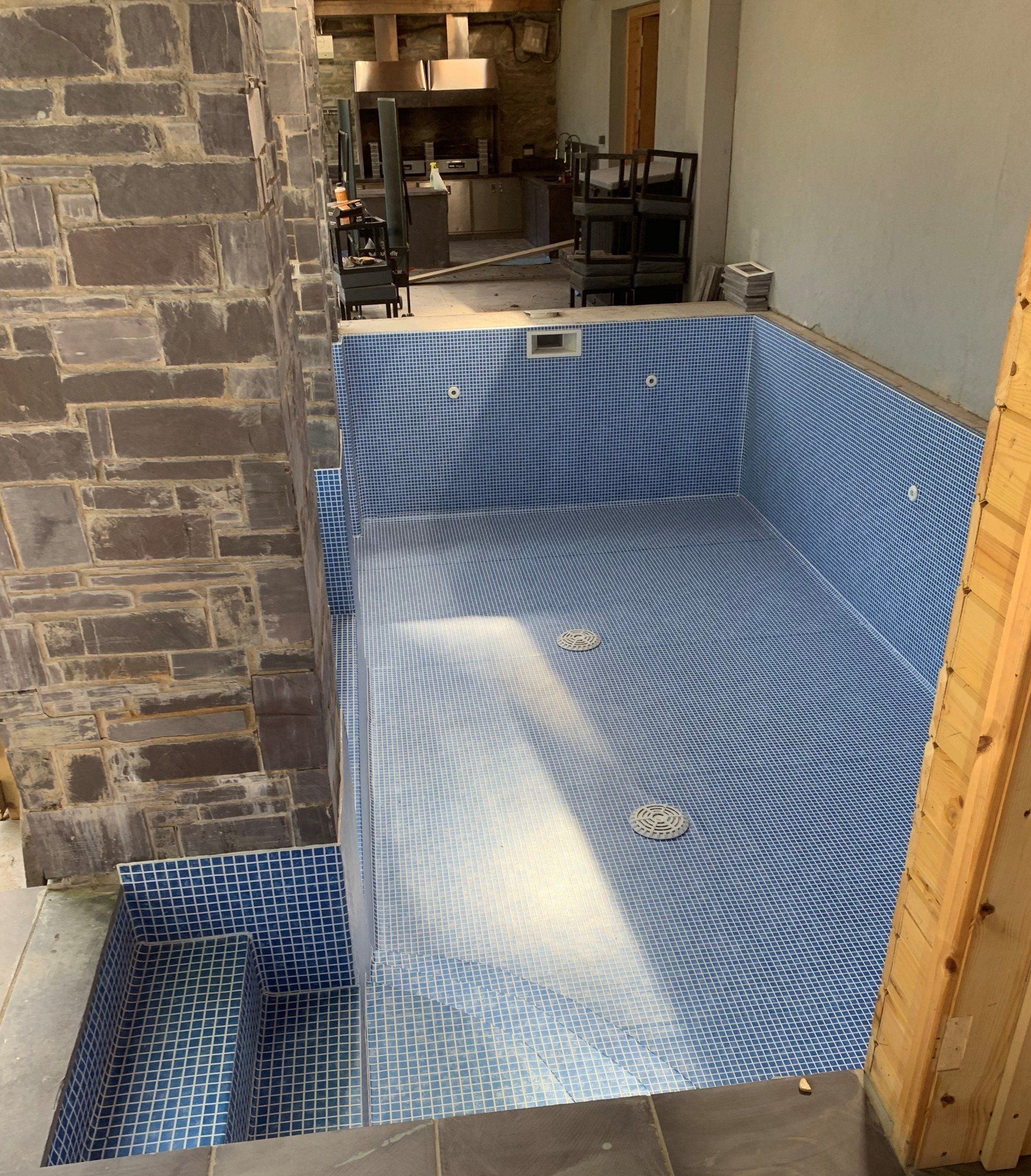 Water-filled Blue Sparks pool with Stoneflex Bazelet steps